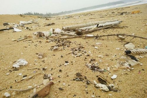 Dầu vón cục còn bám trên rác như bao ni lông, chai lọ… ngoài ra còn lẫn trong cát sau khi thủy triều rút, trôi dạt dọc theo bờ biển.