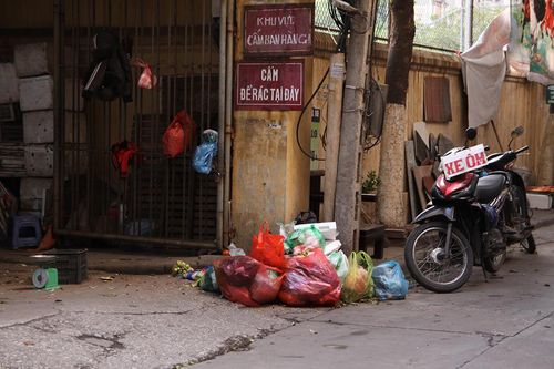 Ghi nhận của VietNamNet, rác vẫn chất đống ở dưới nhiều biển bảng “cấm đổ rác” ở nhiều ngõ phố Hà Nội: