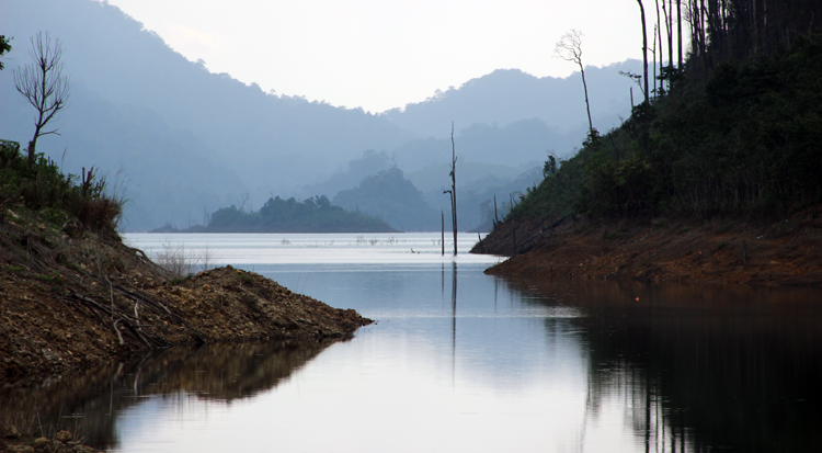 Sáng ngày 26.4, qua quan sát của chúng tôi tại một số khu vực ở ven bờ hồ chứa thủy điện Hà Nang, mực nước của hồ này đã rút xuống nhưng vô số cây quế, keo… với đủ kích cỡ đã chết khô.