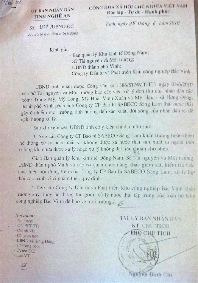 Được biết, từ năm 2010 lần lượt các đoàn thanh, kiểm tra của UBND TP Vinh, Sở TN-MT tỉnh Nghệ An… đã kiểm tra vấn đề ô nhiễm do nước thải của Công ty bao bì Sabeco Sông Lam gây ra và đều kết luận đơn vị này xả thải gây ô nhiễm môi trường nghiêm trọng, ảnh hưởng đến sản xuất cũng như sức khỏe của người dân xã Hưng Đông. Sau nhiều cuộc họp, các cơ quan chức năng đã thống nhất yêu cầu Công ty phải bồi thường thiệt hại về sản xuất cũng như phí cải tạo phục hồi lại môi trường cho người dân nơi đây.