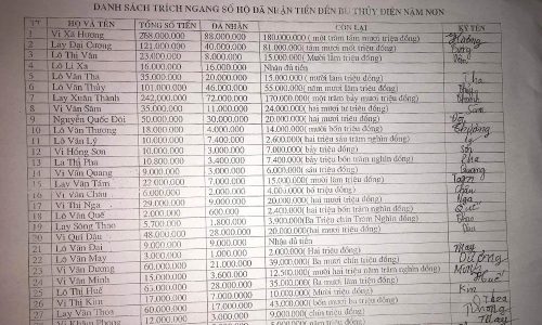 Ông Lay Đại Cương cho biết thêm: Gia đình ông ký nhận sẽ được hưởng 121 triệu đồng, nhưng mới chỉ được 40 triệu. Hôm đó cán bộ giải thích là “bà con ăn Tết xong sẽ được nhận tiền một lần. Hôm nay kho bạc hết tiền, chưa đủ chi trả , bà con tạm thời nhận 1/3 tiền đền bù”.