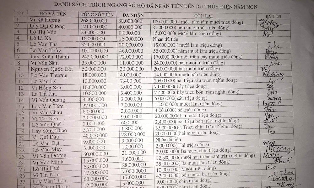 Tổng số tiền 91 hộ dân dân ở bản Lả, xã Lượng Minh mới nhận được tiền đền bù là gần 1,2 tỷ đồng, bằng 1/3 số tiền hồ sơ gốc ban đầu mà họ ký.