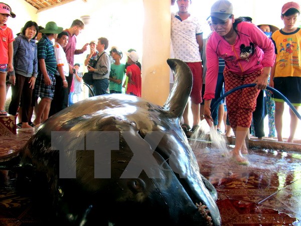 Ông Phạm Cuộc, Trưởng lạch thôn Long Thủy, cho biết theo tập tục của ngư dân Phú Yên, khi nào cá chết mới làm thủ tục chôn cất.