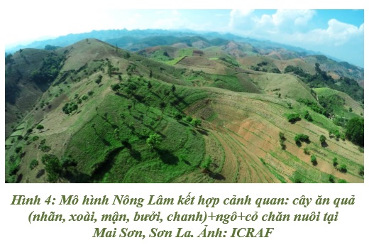 Với thành quả từ hai mô hình nêu trên, có thể khẳng định các mô hình nông lâm kết hợp về lâu dài có hiệu quả kinh tế cao hơn hẳn so với trồng ngô thuần. Đáng chú ý là trong các mô hình này, cỏ chăn nuôi (ghine và mulato) có khả năng sinh trưởng và cho thu hoạch ngay cả trong mùa khô. Theo tính toán sơ bộ, một cá thể bò cần khoảng 30 kg cỏ/ngày để tăng 0,6 kg trọng lượng. Như vậy, cần khoảng 11 tấn cỏ/năm. Với năng suất từ 14-16 tấn/ha/năm thì các hệ thống này đã đóng góp đáng kể cho chăn nuôi của nông hộ nhỏ. Ngoài ra, băng cỏ trong các hệ thống này còn giúp giảm lượng đất trôi theo dòng chảy trong mùa mưa đáng kể. Lượng đất trôi giảm 23% trong hệ thống tếch+mận+cà phê+đỗ tương+cỏ chăn nuôi và giảm đến 56% trong hệ thống nhãn+ngô+cỏ chăn nuôi so với chỉ trồng ngô.