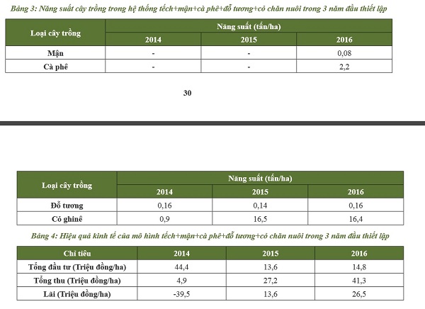 Với mô hình này, đỗ tương và cỏ là hai loại cây cho thu nhập ngay trong năm đầu. Cỏ ghine sau 1 năm cho năng suất trung bình 16,5 tấn/ha/năm (Bảng 3). Cà phê bói quả và cho năng suất từ năm thứ 3 (2,2 tấn/ha). Cây mận bắt đầu bói quả năm thứ 3 sau trồng. Cây gỗ tếch trong hệ thống cho thu hoạch khoảng năm thứ 15. Đánh chú ý là mô hình này cho ngay lợi nhuận từ năm thứ 2, ở mức 13,6 triệu đồng/ha và nông dân đã hoàn được vốn đầu tư ban đầu sau năm thứ 3 (44,4 triệu đồng) (Bảng 4). Tại năm thứ 3, mô hình này đã cho hiệu quả gấp hơn 2 lần so với trồng ngô thuần. Từ năm thứ 4 trở đi, mô hình có nhiều khả năng cho thu nhập cao hơn khi cây cà phê và cây mận trưởng thành cho năng suất cao và ổn định hơn.