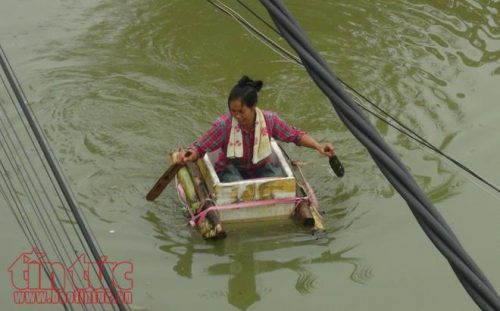 Sau hơn 1 tuần bị vỡ đê, cánh đồng ở xã Tân Tiến (huyện Chưng Mỹ) vẫn ngập trắng nước.Đường làng, ngõ xóm bị ngập lụt, phương tiện chính để di chuyển của người dân là thuyền, mủng.Nhà không có thuyền, chị Nguyễn Mai Liên chế chiếc hộp xốp thành thuyền cho tiện việc đi lại.
