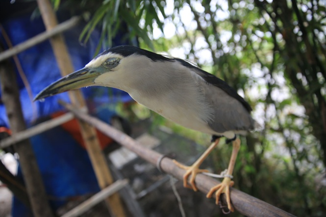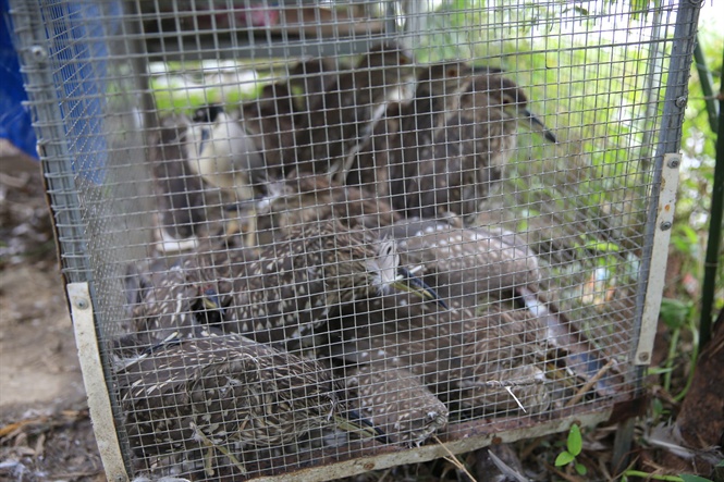 Sau đó vài phút, tôi thực sự sốc khi theo anh Nam ra phía đầu nhà, nơi chứa những lồng cò, vạc vừa bẫy được. Ở đây, trong chiếc lồng lưới sắt, đã có khoảng 2 chục con vạc loại lớn, màu nâu bị bắt. Con nào con nấy đều bị “khoá” chiếc mỏ dài bằng chính chiếc lông cánh của chúng xuyên qua lỗ mũi. Anh Nam giải thích, để chúng không mổ nhau hoặc không mổ người khi bắt chúng. “Từng có người bị nó mổ trúng mắt rồi. Còn mổ rách thịt, chảy máu thì nhiều”, anh Nam nói.