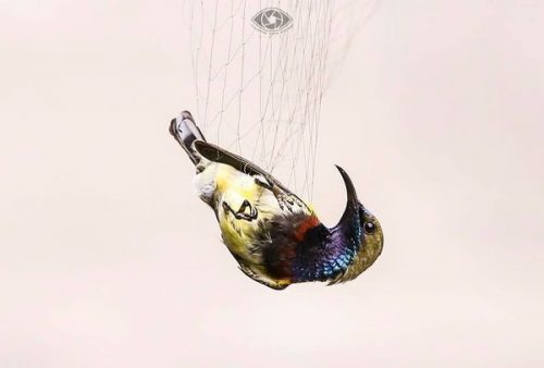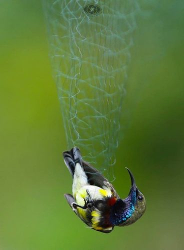 Một con chim hút mật cổ xanh bị dính lưới tại Khu BTTN Sơn Trà. Ảnh: Vuong Van Dung