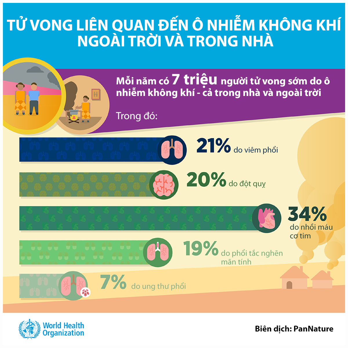 Ô nhiễm không khí vẫn đang duy trì ở mức cao tại nhiều nơi trên thế giới. Các số liệu vừa được Tổ chức Y tế thế giới (WHO) công bố cho thấy có 9/10 người trên thế giới đang hít thở bầu không khí ô nhiễm; khoảng 7 triệu người chết mỗi năm do tiếp xúc với các hạt mịn có trong không khí ở trong nhà và ngoài trời; hơn 3 tỷ người, trong đó hầu hết là phụ nữ và trẻ em đang hít phải khói độc chết người do sử dụng bếp và nhiên liệu ô nhiễm mỗi ngày trong chính ngôi nhà của mình. Riêng năm 2016, có gần 4,2 triệu người chết do ô nhiễm không khí xung quanh và 3,8 triệu người chết do hít phải khói độc khi sử dụng bếp và nhiên liệu gây ô nhiễm. Số lượng tử vong do ô nhiễm không khí xảy ra chủ yếu ở các nước có thu nhập thấp và trung bình thuộc khu vực châu Á, châu Phi, Đông Địa Trung Hải và châu Mỹ. Hãy cùng nhìn lại những con số đầy ám ảnh này qua một số infographic dưới đây.