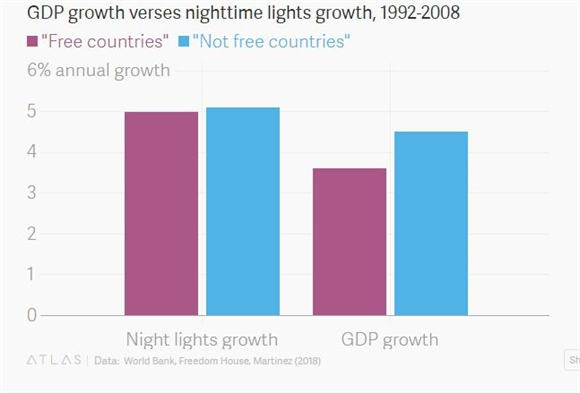 Biểu đồ dưới đây cho thấy sự tăng trưởng trung bình của độ sáng ban đêm và GDP cho các chính phủ mà Freedom House chỉ định là “tự do” và “không tự do”. Lưu ý rằng sự tăng trưởng về ánh sáng ban đêm gần như giống nhau, trong khi tăng trưởng GDP lớn hơn nhiều đối với các quốc gia được xem là “không tự trị”.