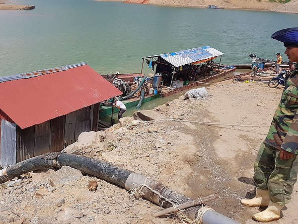 Khi tiếp cận “công xưởng”, ngoài chiếc tàu vỏ sắt đang thi công, phía dưới là một sà lan lớn đang bơm cát, tiếng máy nổ giật cục to đùng vang ra cả một vùng. Trên bờ là một chiếc máy múc loại lớn đang gom cát thành đống như quả núi. Nước từ hoạt động rửa cát phun ra từ các ống nhựa làm xói lở con đường xuống hồ thành một con mương lớn. Nằm ven bờ hồ còn có hai căn nhà tôn đặt trên sà lan. Ngoài hồ, một chiếc tàu sắt khác đang di chuyển đưa ống dò tìm túi cát để hút…