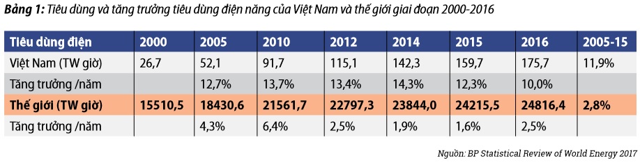 Lĩnh vực năng lượng Việt Nam chứng kiến sự gia tăng tiêu dùng điện năng rất lớn, đặc biệt là từ khi nền kinh tế chuyển từ kế hoạch hóa tập trung sang thị trường. Những năm gần đây, tăng trưởng tiêu dùng điện rơi vào 13%/năm cho giai đoạn 2006-2010 và 10%/năm cho giai đoạn 2010-2015 (Bảng 1). Theo dữ liệu của Quy hoạch điện 7 điều chỉnh, để đáp ứng đủ lượng cầu về điện trong nước, đảm bảo các mục tiêu phát triển kinh tế – xã hội với mức tăng trưởng GDP bình quân khoảng 7,0%/năm trong giai đoạn 2016 – 2030 thì sản lượng điện thương phẩm năm 2020 phải đạt khoảng 235 – 245 tỷ kWh; năm 2025 khoảng 352 – 379 tỷ kWh; năm 2030 khoảng 506 – 559 tỷ kWh. Tương ứng với đó là điện sản xuất và nhập khẩu năm 2020 khoảng 265 – 278 tỷ kWh; năm 2025 khoảng 400 – 431 tỷ kWh và năm 2030 khoảng 572 – 632 tỷ kWh. Từ những dữ liệu đó Bộ Công thương đã đưa ra dự báo trong kịch bản tăng trưởng chậm là mức tăng 10% tiêu dùng điện năng cho tới năm 2020, 8% giai đoạn 2020-2025 và 6% ở giai đoạn 2025-2030[1].