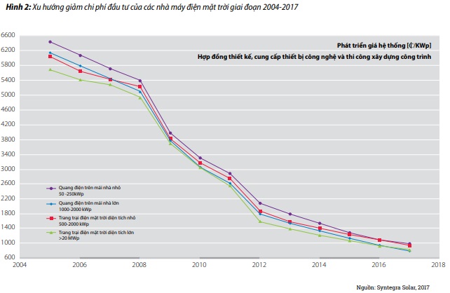 Thứ hai, quy hoạch điện điều chỉnh sau khi từ bỏ điện nguyên tử đã chưa nhìn nhận đúng mực vai trò của các nguồn năng lượng tái tạo ở giai đoạn quy hoạch. Trong khi đó, đây là các nguồn năng lượng sơ cấp mà hầu hết các quy hoạch điện lực của các nước, từ phát triển tới đang phát triển, đều hướng tới vì mục tiêu giảm thải và phát triển bền vững. Đặc biệt, những rào cản trước đây về chi phí đầu tư của các nguồn tái tạo hay các khó khăn kỹ thuật về tính liên tục trong cung ứng đã được giải quyết một cách nhanh chóng nhờ các tiến bộ khoa học công nghệ. Đơn cử, chi phí đầu tư các nguồn điện gió và đặc biệt là điện mặt trời đã giảm nhanh chóng (Hình 2) và với xu hướng như hiện nay tới năm 2020 giá điện mặt trời sẽ cạnh tranh một cách sòng phẳng với điện than và vào năm 2025 giá điện gió sẽ cạnh tranh được với điện than.
