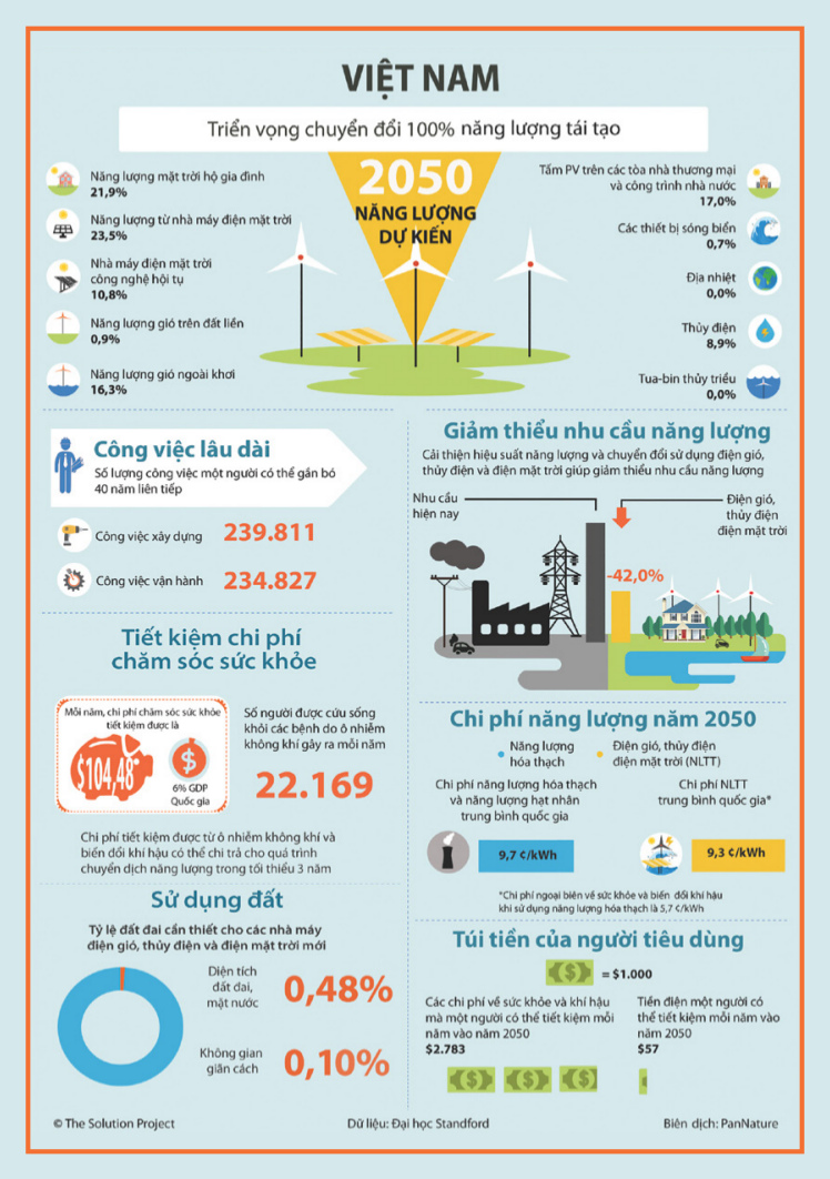 Infographic do Đại học Standford thực hiện dưới đây sẽ chỉ rõ triển vọng chuyển đổi 100% năng lượng tái tạo tại Việt Nam vào năm 2050.