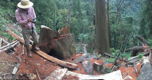 Trên đỉnh núi Phu Lon, xã Tam Đình (huyện Tương Dương, Nghệ An) nhiều cây sa mu cổ thụ bị đốn hạ không thương tiếc.