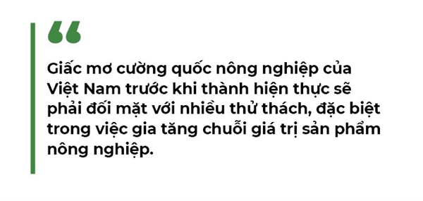Thực tế, đối với nhiều doanh nghiệp, tỉ suất sinh lợi của ngành nông nghiệp là không mấy hấp dẫn khi đối mặt với nhiều rủi ro về giá cả và hàng rào kỹ thuật của các thị trường trọng điểm. Hơn nữa, Hiệp định Đối tác toàn diện và tiến bộ xuyên Thái Bình Dương (CPTPP) sẽ mang đến những thách thức mới cho ngành nông nghiệp khi khá nhiều quốc gia trong khối như Úc, New Zealand từ lâu đã là các cường quốc xuất khẩu nông nghiệp nổi tiếng. Vì vậy, giấc mơ cường quốc nông nghiệp của Việt Nam trước khi thành hiện thực sẽ phải đối mặt với nhiều thử thách, đặc biệt trong việc gia tăng chuỗi giá trị sản phẩm nông nghiệp.