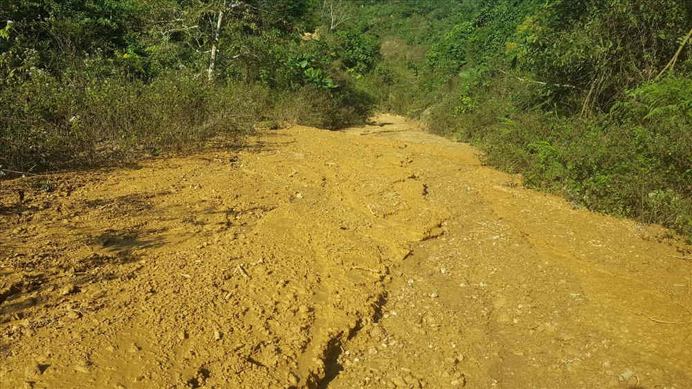 Quan sát xung quanh, dễ dàng thấy từng mạn đồi bị xói thành dòng sâu hoắm, cách vị trí khai thác vàng trái phép khoảng 100m về phía hạ nguồn, những dòng bùn thải đặc quánh nhuốm vàng cả một vùng rộng lớn hàng trăm mét vuông.