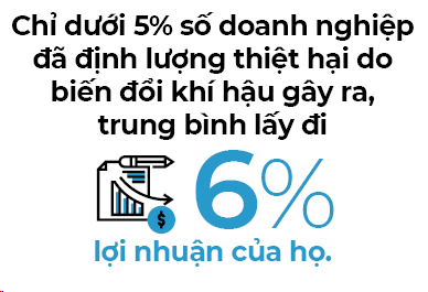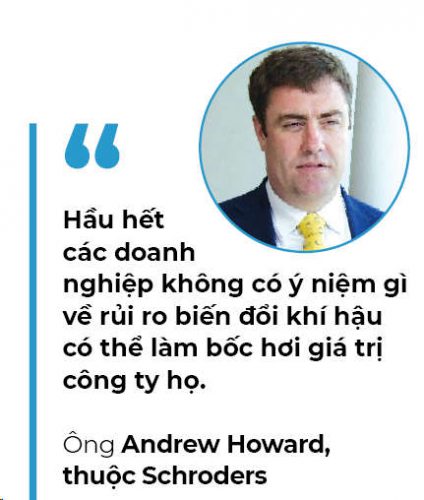 Có lý do để phải quan ngại. Vào tháng 8.2018, các chuyên gia phân tích tại công ty quản lý tài sản Schroders đã theo dõi 11.000 công ty toàn cầu niêm yết và ước tính việc tính đúng rủi ro vật chất do biến đổi khí hậu có thể lấy đi trung bình 2-3% giá trị của họ. Một số ngành có thể bị tác động mạnh hơn: dịch vụ tiện ích và dầu khí mất tới 4-4,5%. Một số doanh nghiệp đối mặt với rủi ro mất đi tới 20% giá trị. Đáng nói là theo Andrew Howard, thuộc Schroders, hầu hết doanh nghiệp lại không hề có ý niệm gì về rủi ro này.