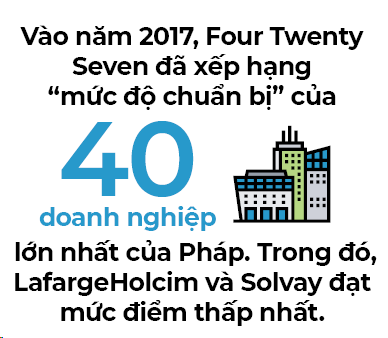 Các chuyên gia tư vấn môi trường cũng hăm hở vào cuộc để hỗ trợ doanh nghiệp. Acclimatise, một công ty Anh có thâm niên trong ngành, đang tư vấn cho khoảng 40 tập đoàn lớn và hàng chục các tổ chức nhà nước cũng như các tổ chức phi chính phủ. Four Twenty Seven (Mỹ) cũng theo dõi hàng trăm ngàn cơ sở để đánh giá mức độ dễ bị tổn thương trước các rủi ro khí hậu. Năm 2017, Four Twenty Seven đã xếp hạng “mức độ chuẩn bị” của 40 doanh nghiệp lớn nhất của Pháp. Trong đó, 2 nhà sản xuất vật liệu là LafargeHolcim và Solvay xếp hạng thấp nhất.