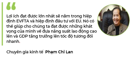 Theo bà Phạm Chi Lan, EVFTA sẽ đem lại cho Việt Nam nhiều thuận lợi bởi khi có hiệp định, tất cả các lĩnh vực từ xuất nhập khẩu, thu hút đầu tư, công ăn việc làm … đều cao hơn hẳn so với CPTPP. “Lợi ích đạt được lớn nhất sẽ nằm trong hiệp định EVFTA và hiệp định đầu tư với EU. Nó có thể giúp cho chúng ta đạt được những khát vọng của mình về đưa năng suất lao động cao lên và GDP tăng trưởng lên tốc độ tương đối nhanh”, bà Lan nhấn mạnh.