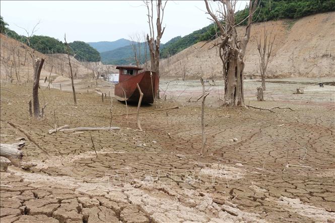 Có mặt tại lòng hồ thủy điện Bản Vẽ ngày 3/7, dễ dàng nhận thấy mực nước xuống thấp hàng chục mét khi dấu vết những chỗ đất trống hiện ra. Nhiều đoạn trong lòng hồ trơ đáy, thuyền của người dân nằm trên những vạt đất nứt nẻ.