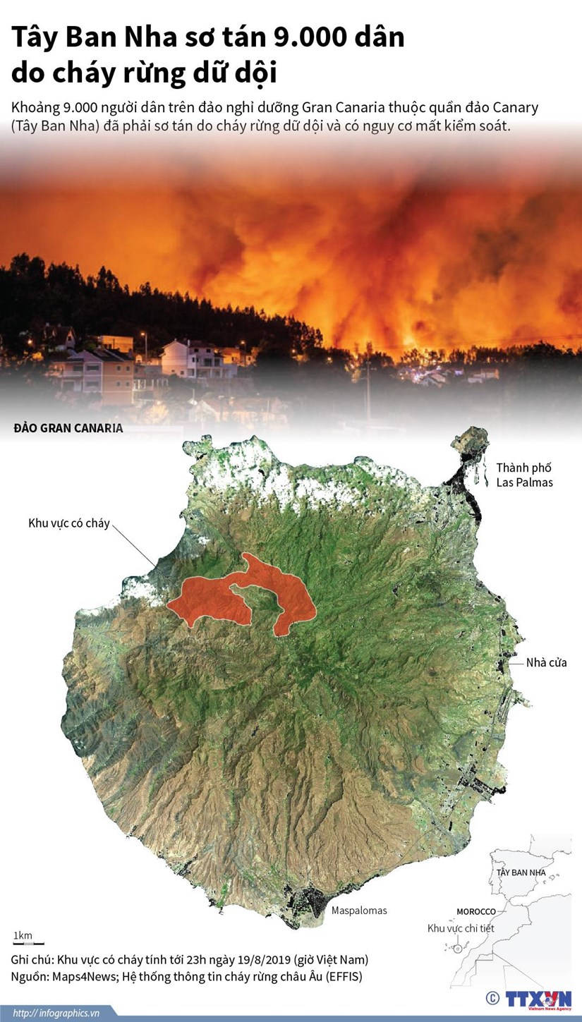 Khoảng 9.000 người dân trên đảo nghỉ dưỡng Gran Canaria thuộc quần đảo Canary (Tây Ban Nha) đã phải sơ tán do cháy rừng dữ dội và có nguy cơ mất kiểm soát.