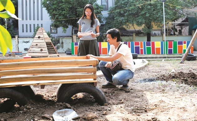 Khác những sân chơi trong thành phố trên nền bê-tông với những thiết bị đúc sẵn sáng bóng được sản xuất hàng loạt, sân chơi mới của phường 15, quận Gò Vấp tràn ngập những vật liệu tái chế được đặt trên nền đất. Đây là chiếc bập bênh bốn cạnh cho phép hàng chục trẻ con chơi cùng một lúc, được tạo thành từ những chiếc lốp cũ, dây thừng và những thanh gỗ mộc. Kia là những chiếc xích đu được làm từ những cây gỗ nhỏ được sơn phết sặc sỡ, những mảnh ván và dây thừng… Đó là sân chơi “Nam tiến” đầu tiên của Think Playgrounds (TPG – Nghĩ về sân chơi trong phố), doanh nghiệp xã hội của những bạn trẻ muốn giành lại quyền được chơi của trẻ em phố thị.