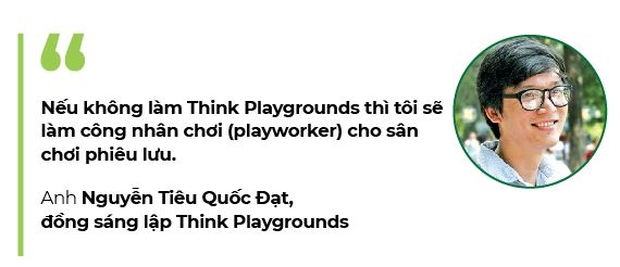 “Nếu không làm TPG thì tôi sẽ làm công nhân chơi (playworker) cho sân chơi phiêu lưu”, Đạt rộn rã lên khi nói về công việc chuyên môn tại mô hình sân chơi mà họ đang hướng đến. Sau thành công của sân chơi phiêu lưu (adventure playground) đầu tiên họ xây dựng được tại khu đô thị Ecopark, TPG đưa mô hình này vào bản kế hoạch sắp tới.