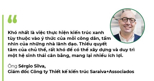 “Trên thực tế, việc cân bằng giữa tài chính, sự tiện lợi trong thi công, bảo dưỡng công trình và duy trì màu xanh các khối kiến trúc không hề đơn giản. Nó đòi hỏi nỗ lực cả từ phía chủ công trình lẫn đơn vị thiết kế, thi công. Tuy nhiên, kiến trúc xanh là xu hướng xây dựng của tương lai và là lựa chọn lớn nhất của khách hàng trên toàn cầu”, ông Sérgio Silva nói.