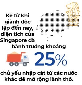 Ở phương diện này, Singapore là quốc gia “tích cực” nhất, chủ yếu nhập cát từ các nước khác. Kể từ khi giành độc lập cách đây hơn 50 năm, diện tích của Singapore đã bành trướng gần 25%, từ 580km2 lên tới gần 725km2 vào năm 2018 và dự kiến sẽ đạt gần 777km2 vào năm 2030. Singapore đã nhập khẩu 64 triệu tấn cát từ Malaysia vào năm 2018, chiếm hơn 97% tổng lượng cát nhập khẩu. Tuy nhiên, Malaysia đã cấm xuất khẩu cát sang Singapore vào năm ngoái. Không chỉ Malaysia, một số quốc gia khác cũng đã cấm hoặc hạn chế xuất khẩu cát sang Singapore, trong đó có Indonesia, Việt Nam, Campuchia.
