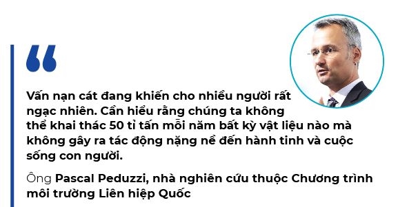“Vấn nạn cát đang khiến nhiều người rất ngạc nhiên. Cần hiểu rằng chúng ta không thể khai thác 50 tỉ tấn mỗi năm bất kỳ vật liệu nào mà không gây ra tác động nặng nề đến hành tinh này và cuộc sống con người”, Pascal Peduzzi, nhà nghiên cứu thuộc Chương trình môi trường Liên hiệp Quốc (UNEP), nhận định.