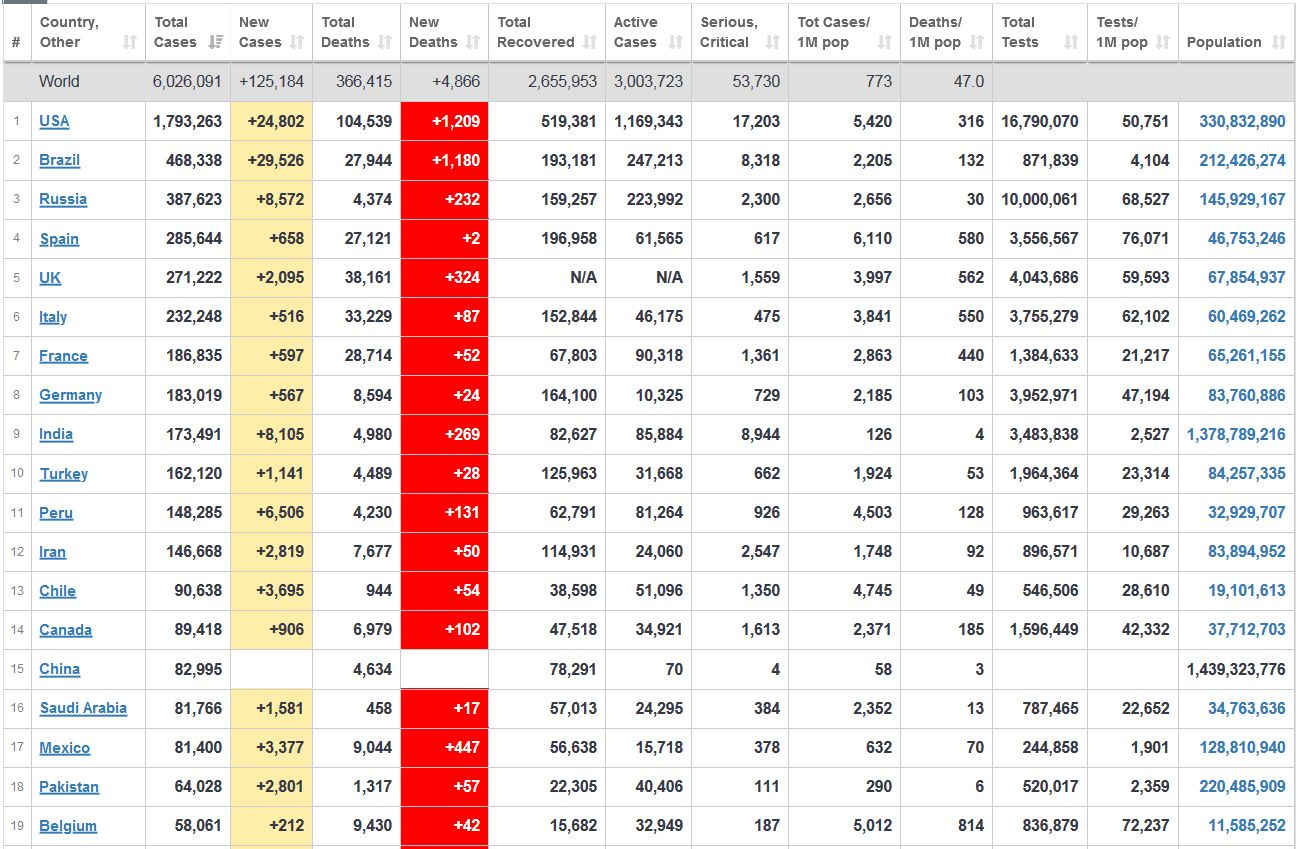 Như vậy, thế giới hiện ghi nhận 6.026.091 người mắc Covid-19, trong đó có 366,415 ca tử vong và 2.655.953 người bình phục.