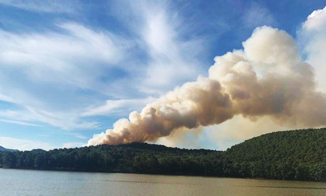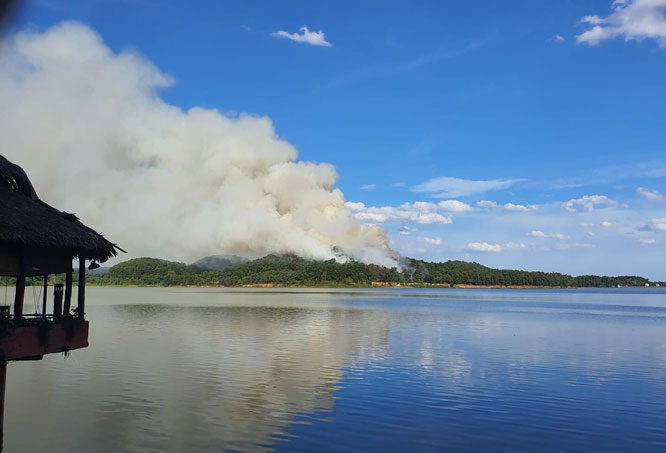 Do thời tiết nắng nóng kéo dài, cuối giờ chiều 8-6, trên địa bàn xã Tiên Dược (huyện Sóc Sơn) xảy ra cháy rừng phòng hộ, gần khu vực đập hồ Đồng Quang.
