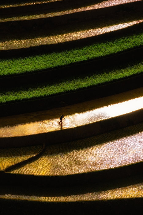 Những thửa ruộng mới cấy xanh rì, đan xen cùng luống đất nâu lóng lánh nước. Ruộng bậc thang là sự kết hợp hoàn hảo giữa vẻ hùng vĩ của núi rừng cùng vẻ đẹp của lao động sáng tạo, trải qua bao đời, bao thế hệ. Theo tác giả, điều đáng quý ở đây là lao động khai thác nhưng không hủy hoại môi trường mà còn bảo vệ và tôn tạo thiên nhiên. Lao động giúp thiên nhiên đẹp hơn và nuôi sống con người bằng lúa gạo.