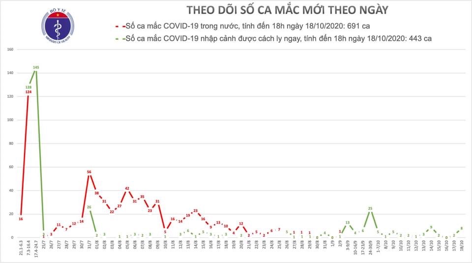 Tính đến 18h ngày 18/10, Việt Nam có tổng cộng 1134 ca mắc COVID-19, trong đó có 691 ca mắc COVID-19 do lây nhiễm trong nước. Tổng số người tiếp xúc gần và nhập cảnh từ vùng dịch đang được theo dõi sức khỏe (cách ly) là 13.515 trường hợp. Số ca tử vong là 35 ca. Số ca điều trị khỏi là 1.031 ca.