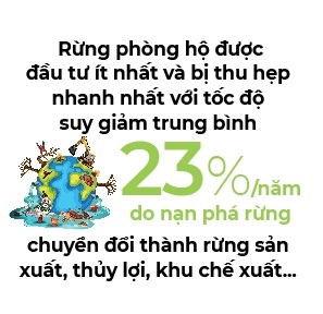 Theo thống kê của Bộ Nông nghiệp và Phát triển Nông thôn, đến nay cả nước có 14,45 triệu ha rừng, gồm rừng đặc dụng là 2,15 triệu ha, rừng phòng hộ 4,64 triệu ha, còn lại là rừng sản xuất. Trong đó, rừng phòng hộ được đầu tư ít nhất và bị thu hẹp nhanh nhất với tốc độ suy giảm trung bình 23%/năm do nạn phá rừng, chuyển đổi thành rừng sản xuất, thủy lợi, khu chế xuất…
