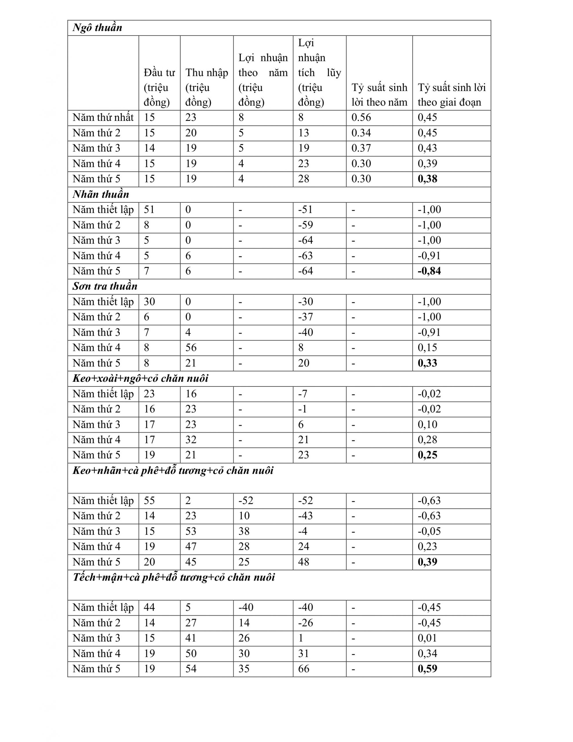 Bảng 1 cho thấy tùy từng hệ thống nông lâm kết hợp mà cho thu hồi vốn vào năm thứ 3 (Keo+xoài+ngô+cỏ chăn nuôi và Tếch+mận+cà phê+đỗ tương+cỏ chăn nuôi) hay năm thứ 4 (Keo+nhãn+cà phê+đỗ tương+cỏ chăn nuôi) khi giá trị lợi nhuận tích lũy lớn hơn 0 (Bảng 1).
