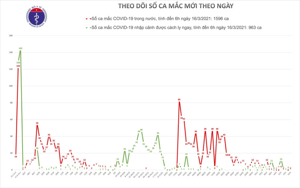 Tính đến 6h ngày 16/3: Việt Nam có tổng cộng 1596 ca mắc COVID-19 do lây nhiễm trong nước.