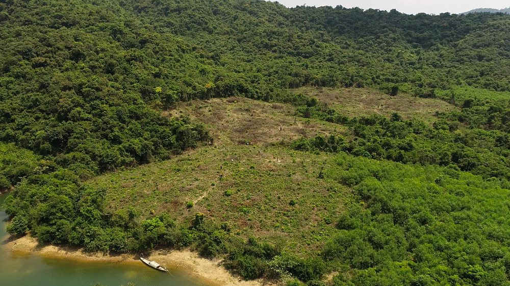 Để tiếp cận được khu vực rừng bị chặt phá chúng tôi được anh T một người dân địa phương dẫn đường. Theo anh T cách tiếp cận gần nhất khu vực rừng bị phá là đi đò qua lồng hồ Rào Đá. Đi đò khoảng 20 phút chúng tôi đã tiếp cận được khu vực rừng phòng hộ bị chặt hạ. Tại đây, khá bất ngờ khi có khoảng 5h rừng phòng hộ đầu nguồn đã bị “cạo trắng”. Nhiều cây gỗ quý như Lim, Gõ, Trường, Ươi…có đường kính từ 10-40cm đều bị chặt hạ, các thân cây đã được vận chuyển ra khỏi khu vực này.