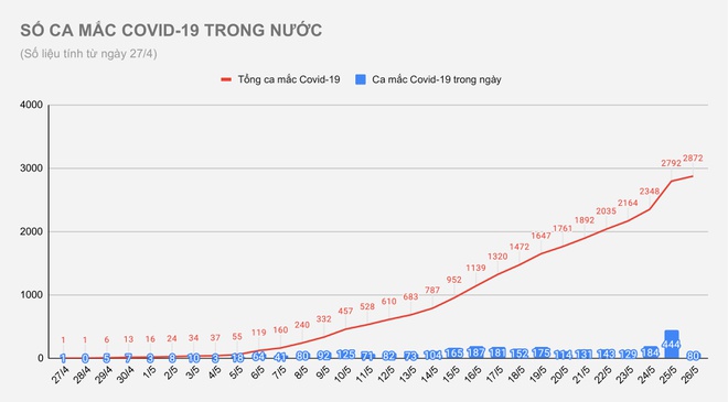 Từ ngày 27/4 đến nay, Việt Nam ghi nhận tổng cộng 2.872 ca mắc Covid-19 trong nước tại 30 tỉnh, thành phố. Bắc Giang vẫn là địa phương có số lượng người mắc cao nhất.