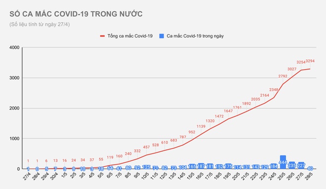 Như vậy, tính từ ngày 27/4 đến nay, Việt Nam có tổng cộng 3.294 bệnh nhân Covid-19.