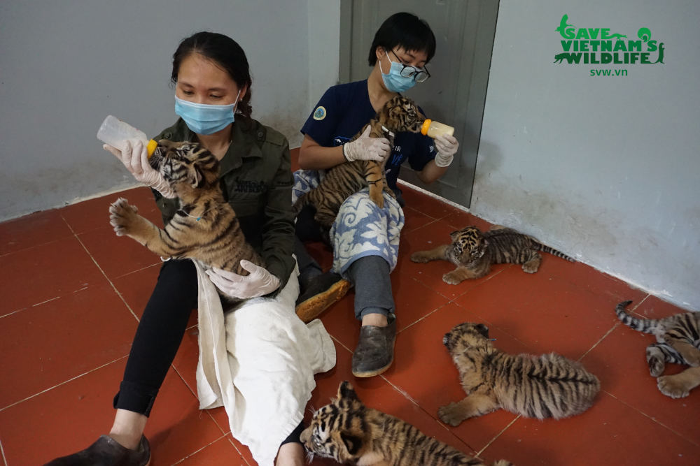 Ngay sau khi được Phòng Cảnh sát Môi trường, Công An tỉnh Nghệ An đề nghị tiếp nhận, đại diện VQG đã phối hợp cùng SVW nhanh chóng đến hiện trường để kịp thời chăm sóc, cho uống sữa và cứu hộ 7 cá thể hổ con.