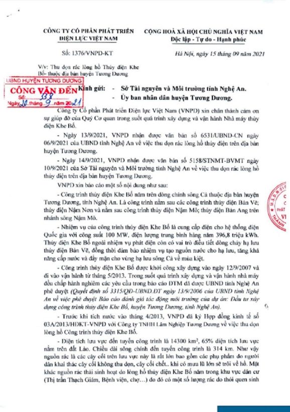 Tuy nhiên, trong văn bản số 1376/VNPD-KT, ngày 15/9/2021 của Công ty CP phát triển điện lực Việt Nam (chủ đầu tư thuỷ điện Khe Bố) gửi Sở TN&MT tỉnh Nghệ An và UBND huyện Tương Dương thì về “cơ bản” đơn vị này cũng đã có “quan tâm” vớt rác, xử lý làm sạch môi trường lòng hồ?