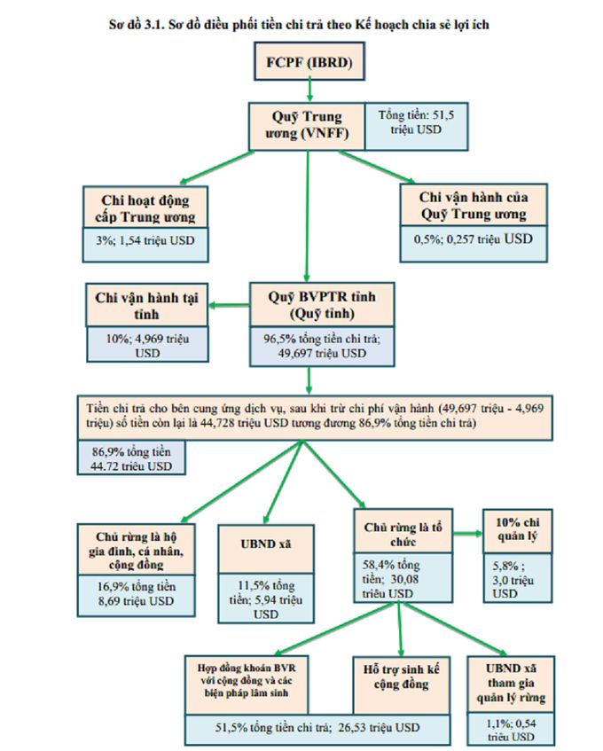 Việc thỏa thuận chi trả giảm phát thải (ERPA) nhằm chuyển nhượng 10,3 triệu tấn CO2 đã được ký kết năm 2020 giữa Bộ NN-PTNT (cơ quan thực hiện Chương trình) và Ngân hàng Tái thiết và và Phát triển quốc tế (IBRD) – đơn vị được Quỹ đối tác carbon Lâm nghiệp ủy thác. Theo kế hoạch chia sẻ lợi ích, dự kiến tiền điều phối cho các tỉnh từ năm 2023 – 2025 như sau: Thanh Hóa hơn 8,3 triệu USD; Nghệ An hơn 14,5 triệu; Hà Tĩnh trên 6,3 triệu; Quảng Bình trên 12,1 triệu; Quảng Trị hơn 2,6 triệu và Thừa Thiên Huế hơn 5,6 triệu USD. |