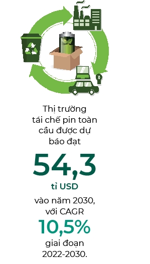 Một số chuyên gia ước tính nhờ tốc độ tăng trưởng nhanh của thị trường tái chế pin (dự báo đạt 54,3 tỉ USD trên toàn cầu vào năm 2030, theo MarketsandMarkets), 40% vật liệu pin được sử dụng trong các xe điện mới có thể sẽ đến từ nguồn tái chế vào năm 2040.