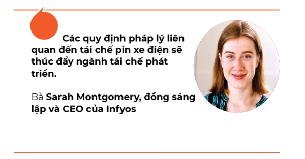 Điều này càng nâng cao tầm quan trọng của việc tái chế, nhất là khi việc tái chế hiệu quả cũng giúp giảm phụ thuộc vào nhập khẩu vật liệu sản xuất pin, đảm bảo nguồn cung. “Tái chế không phải là ưu tiên hàng đầu của ngành này. Công nghệ tái chế pin lithium-ion hiện hữu chưa hoạt động ở quy mô lớn”, Sarah Montgomery, đồng sáng lập và CEO Infyos, nhận xét. Nhưng bà cho biết nay gió đã đổi chiều. Bà dẫn chứng về những thay đổi trong quy định do Liên minh châu Âu khởi xướng để tăng tỉ lệ tái chế pin và thúc đẩy quy trình tái chế bền vững hơn. Tháng 7/2023 Hội đồng Châu Âu đã áp dụng “hộ chiếu pin”, theo đó yêu cầu một tỉ lệ bắt buộc về các vật liệu được tái chế trong ô tô điện và trong các loại pin công nghiệp đến năm 2031.
