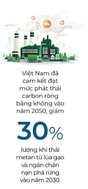 Việt Nam đã cam kết đạt mức phát thải carbon ròng bằng không vào năm 2050, giảm 30% lượng khí thải metan từ lúa gạo và ngăn chặn nạn phá rừng vào năm 2030. Sự chuyển dịch sang một ngành nông nghiệp xanh, bền vững không chỉ đóng góp rất lớn vào xây dựng một nền kinh tế xanh, mà còn thể hiện trách nhiệm mạnh mẽ hơn với cộng đồng người tiêu dùng quốc tế.