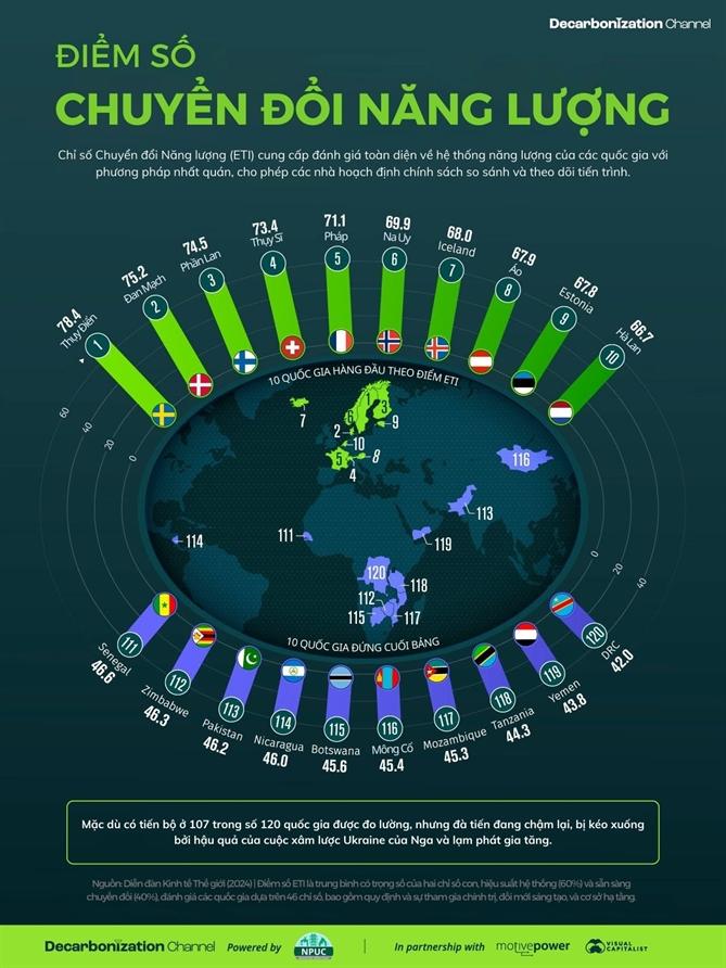 Diễn đàn Kinh tế Thế giới (WEF) gần đây đã công bố Báo cáo Chuyển đổi Năng lượng 2024, đánh giá 120 quốc gia trên toàn thế giới về nỗ lực giảm phát thải carbon và xếp hạng họ dựa trên Chỉ số Chuyển đổi Năng lượng (ETI).