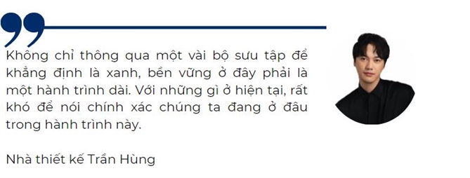 “Không chỉ thông qua một vài bộ sưu tập để khẳng định là xanh, bền vững ở đây phải là một hành trình dài. Với những gì ở hiện tại, rất khó để nói chính xác chúng ta đang ở đâu trong hành trình này”, nhà thiết kế Trần Hùng, vốn dành nhiều tâm huyết cho thời trang bền vững, nói về cái khó của dòng thời trang này trong nước.