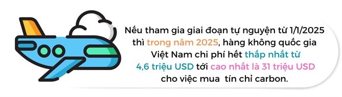 Nếu tham gia giai đoạn tự nguyện từ 1/1/2025 thì trong năm 2025, hàng không quốc gia Việt Nam chi phí hết thấp nhất từ 4,6 triệu USD tới cao nhất là 31 triệu USD cho việc mua tín chỉ carbon. Trong năm 2026, các con số tương ứng sẽ là 5,6 triệu USD và 37,5 triệu USD.